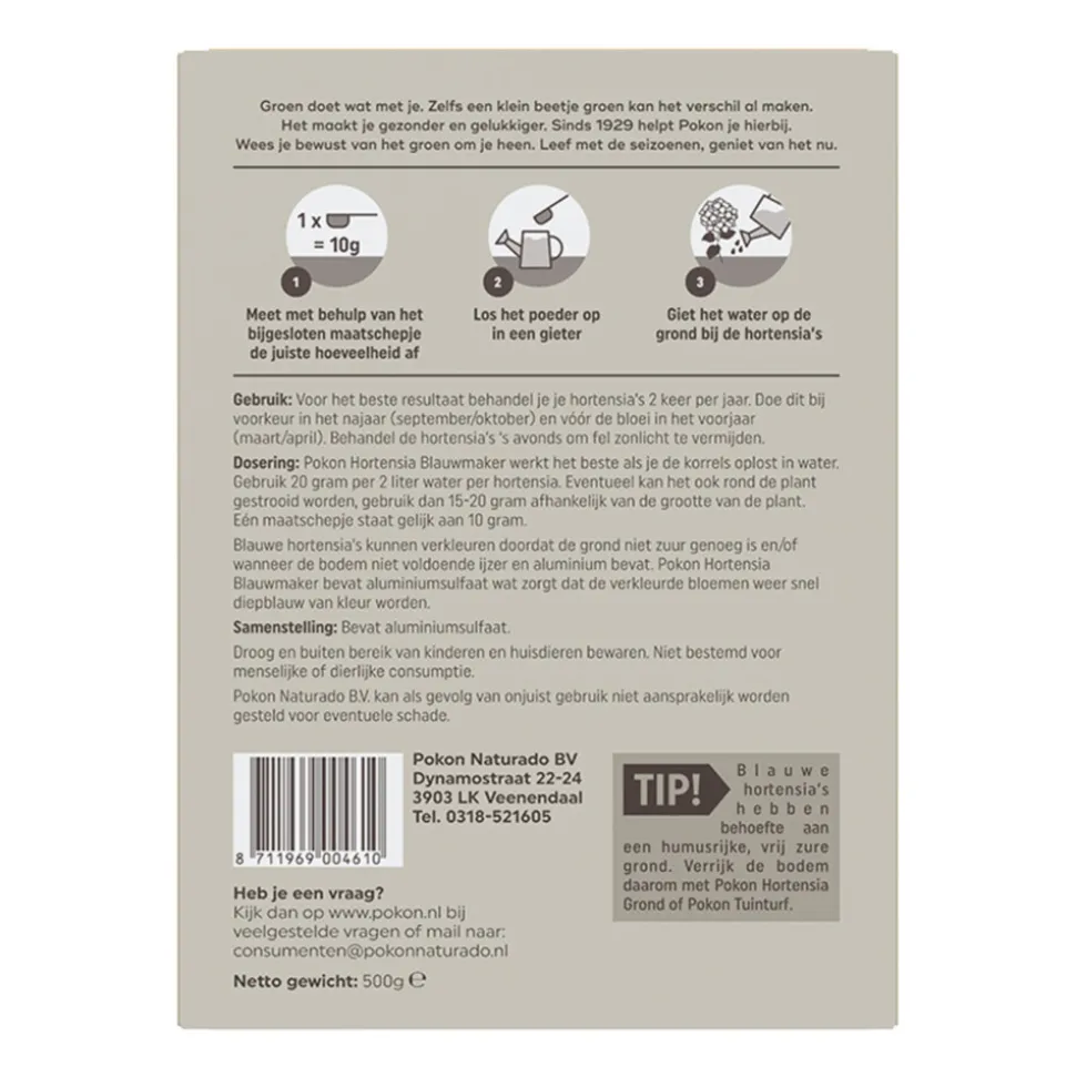 Pokon Hortensia Blauwmaker helpt hortensia’s hun prachtige diepblauwe kleur terug te krijgen. Wanneer de grond niet zuur genoeg is of te weinig ijzer en aluminium bevat, kunnen de bloemen verkleuren. Dit product bevat aluminiumsulfaat, wat de juiste bodemomstandigheden creëert voor een intense blauwe kleur. Voor het beste resultaat behandel je de hortensia’s twee keer per jaar: in het najaar (september/oktober) en in het voorjaar vóór de bloei (maart/april). Breng het bij voorkeur ’s avonds aan om fel zonlicht te vermijden.
