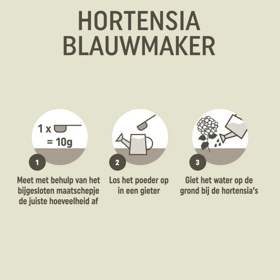 Meet met behulp van het bijgesloten maatschepje de juiste hoeveelheid af. Los het poeder op in een gieter. Giet het water op de grond bij de hortensia’s.