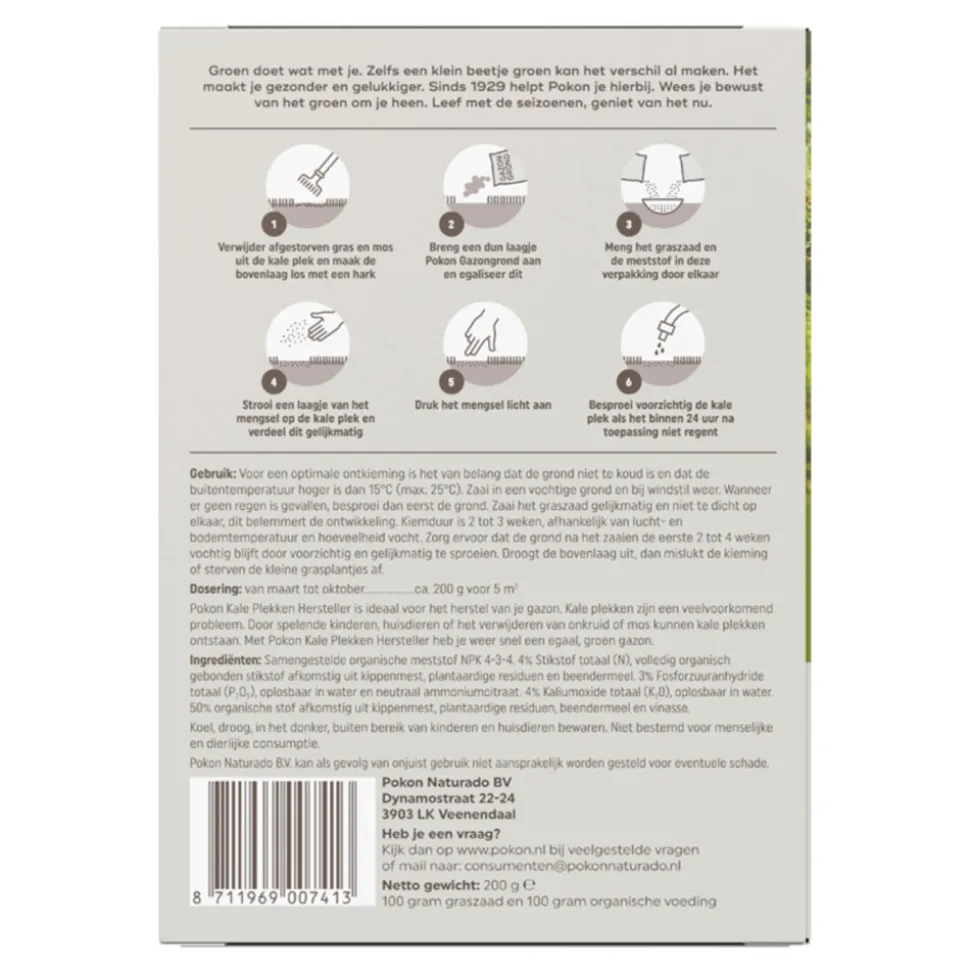 Verwijder afgestorven gras en mos uit de kale plek en maak de bovenlaag los met een hark. Breng een dun laagje Pokon Gazongrond aan en egaliseer dit. Meng het graszaad en de meststof in deze verpakking door elkaar. Strooi een laagje van het mengsel op de kale plek en verdeel dit gelijkmatig. Druk het mengsel licht aan. Besproei voorzichtig de kale plek als het binnen 24 uur na toepassing niet regent.