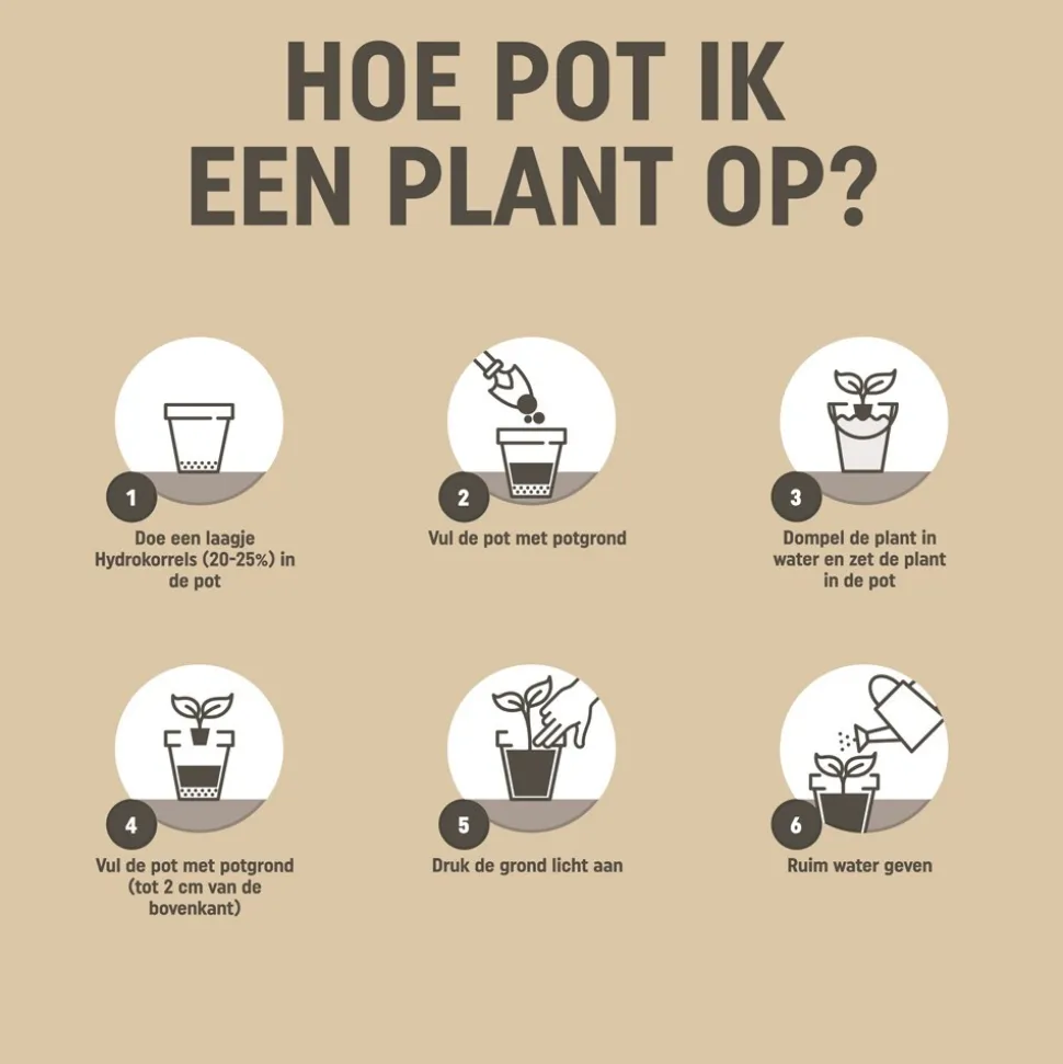 Graaf een plantgat 2x zo groot als de kluit. Dompel je plant in water. Zet de plant in de grond. Meng 1/3 aanplantgrond met 2/3 van de bestaande grond en vul het gat. Druk de grond een beetje aan. Geef voldoende water.
