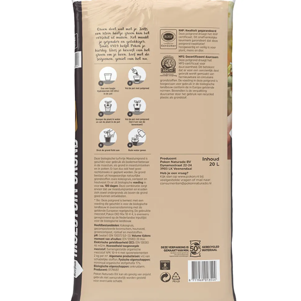 Deze biologische potgrond is geschikt voor universeel gebruik in de moestuin. Pokon Bio Moestuin Grond kan gebruikt worden als bodemverbeteraar, maar kan ook rechtstreeks in geplant worden. De grond bestaat uit hoogwaardige natuurlijke grondstoffen zoals turfstrooisel en houtvezel. Deze houtvezel maakt de grond luchtiger. Er zit voldoende voeding in voor ca. 100 dagen. De hernieuwbare grondstoffen in deze potgrond zorgen ervoor dat de grond er anders uit ziet dan je wellicht gewend bent.