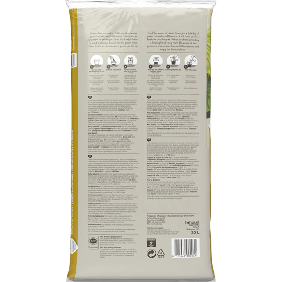 Pokon Potgrond Kamerplanten is geschikt voor alle kamerplanten, dus zowel voor bloeiende als voor groene planten. Kamerplanten staan binnen niet in hun natuurlijke omgeving en hebben daarom een goede voedingsbodem nodig. Deze grond bestaat uit hoogwaardige grondstoffen als tuinturf, grove turfblokjes en turfstrooisel. Er zit daarnaast voldoende voeding in voor ca. 180 dagen.