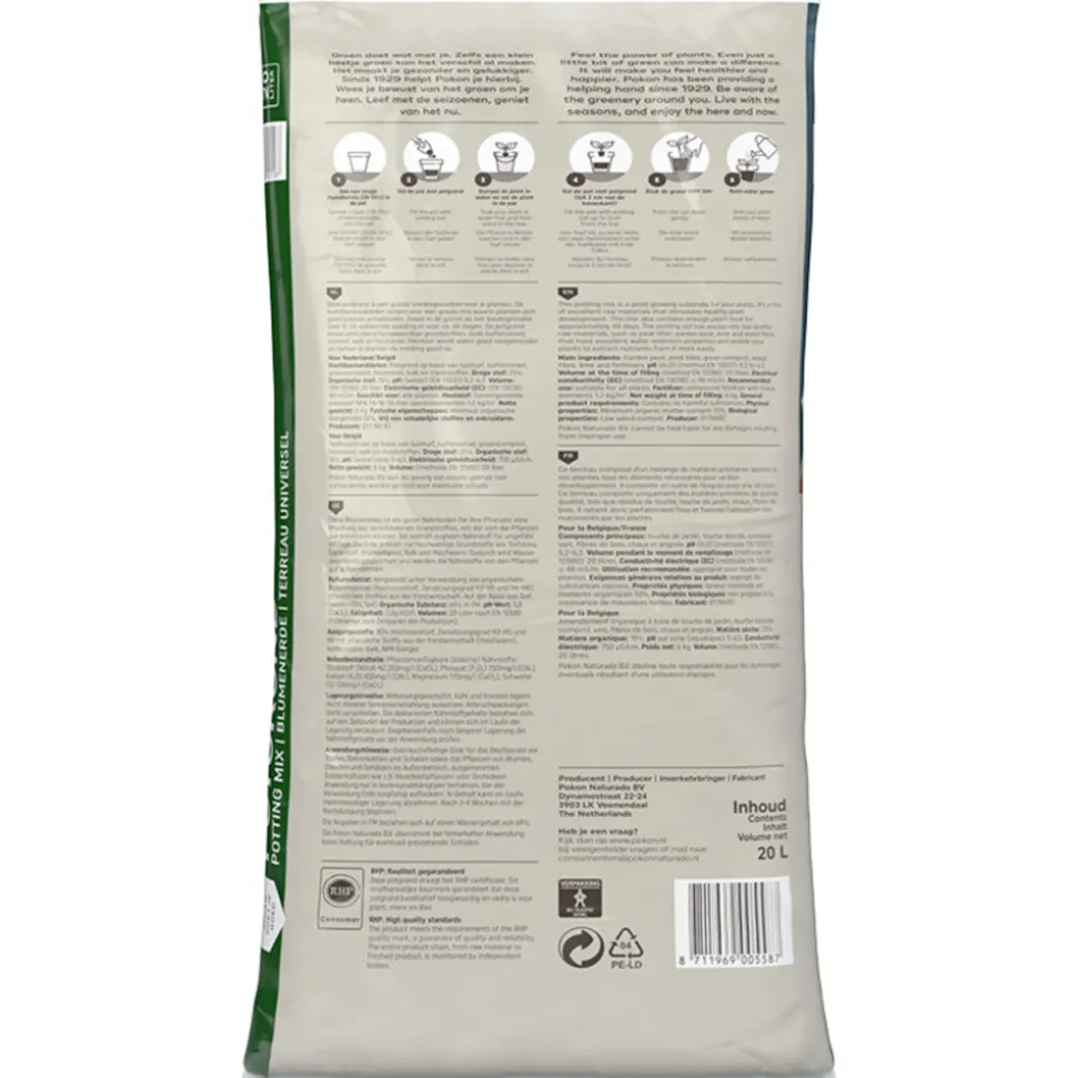 Deze Pokon Potgrond Universeel is een goede voedingsbodem voor je planten. De hoofdbestanddelen zorgen voor een goede mix waarin planten zich goed kunnen ontwikkelen. Zowel in de grond als het bovengrondse deel. Er zit voldoende voeding in voor ca. 60 dagen. De potgrond bevat uitsluitend hoogwaardige grondstoffen, zoals turfstrooisel, tuinturf, kalk en houtvezel. Hierdoor wordt water goed vastgehouden en nemen je planten de voeding goed op.