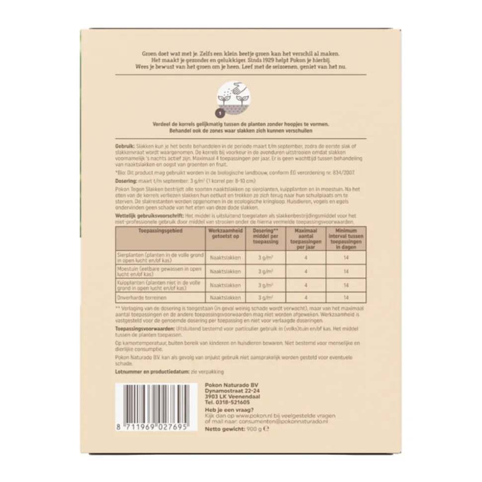 Pokon Bio Tegen Slakken Korrels bestrijdt alle soorten naaktslakken op sierplanten, kuipplanten en in moestuin. Na het eten van de korrels verliezen slakken hun eetlust en trekken ze zich terug naar hun schuilplaats om te sterven. De slakrestanten worden opgenomen in de ecologische kringloop. Huisdieren, volgens en egels ondervinden geen schade van het eten van deze dode slakken. Slakken kun je het beste behandelen in de periode maart t/m september, zodra de eerste slak of slakkenvraag wordt waargenomen. De korrels bij voorkeur in de avonduren uitstrooien omdat slakken voornamelijk ’s nachts actief zijn. Maximaal 4 toepassingen per jaar. Er is geen wachttijd tussen behandeling van naaktslakken en oogst van groenten en fruit.