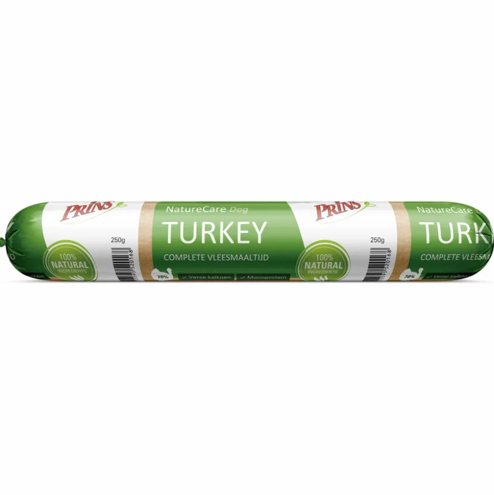 Prins NatureCare Hypoallergeen Hondenvoer Worst Kalkoen is een gezonde, 100% natuurlijke en volledige vleesmaaltijd voor je hond in een worst. Erg handig om mee te nemen en makkelijk in stukjes te snijden. Een lekkere afwisseling op de dagelijkse voeding en ideaal als beloning tijdens de training! Laat de NatureCare worstvoeding op kamertemperatuur komen en snijd de worst in hapklare blokjes voordat je het aan jouw hond geeft.