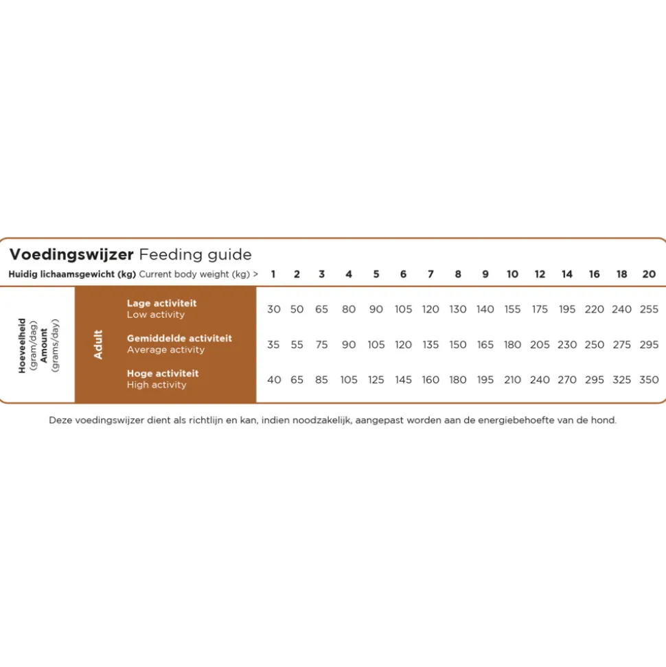 Verdeel de dagelijkse portie voedsel over minimaal twee maaltijden per dag. Zorg dat er altijd voldoende vers water voor je hond klaar staat. Meng gedurende minimaal 7 dagen steeds meer nieuwe voeding door de oude voeding tot je geheel bent overgestapt. Bewaar advies: koel en droog bewaren. Sluit de zak na gebruik goed af. Ten minste houdbaar tot/productiecode: zie achterkant verpakking.