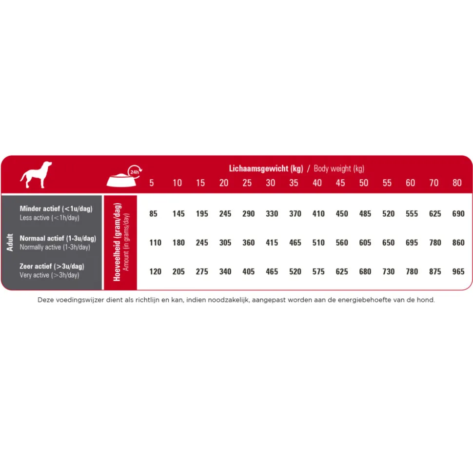 - Verlaagd vetgehalte. Bevat een verlaagd vetgehalte, speciaal voor volwassen honden met een lagere energiebehoefte