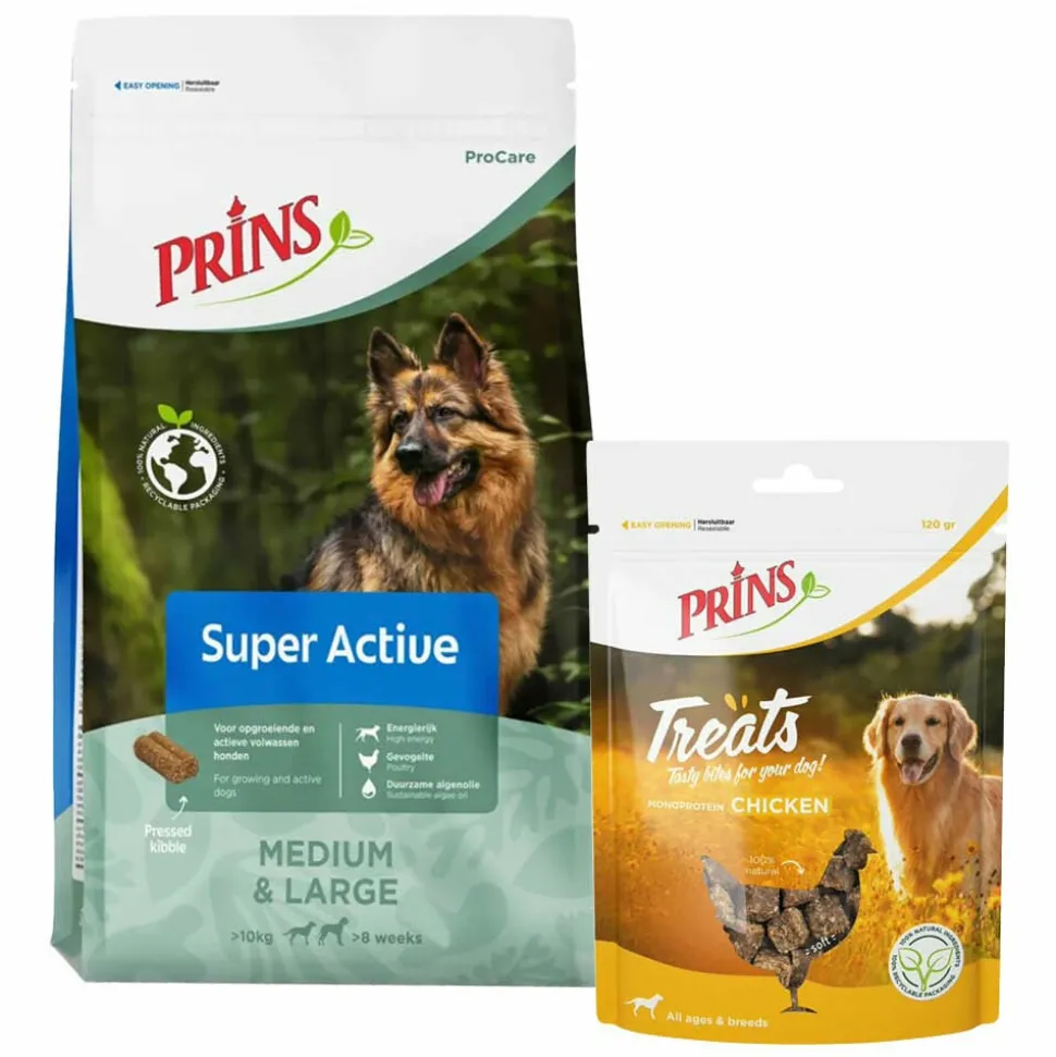 Prins ProCare Super Active is een geperste voeding voor opgroeiende en actieve honden, die zorgt voor een goede conditie, gezonde huid en glanzende vacht. Prins Treats Chicken zijn heerlijke traktaties van verantwoord gekweekte kip, speciaal voor honden met voedselgevoeligheden. Beide producten dragen bij aan het welzijn van je hond en worden geleverd in recyclebare verpakkingen voor een duurzamere keuze.