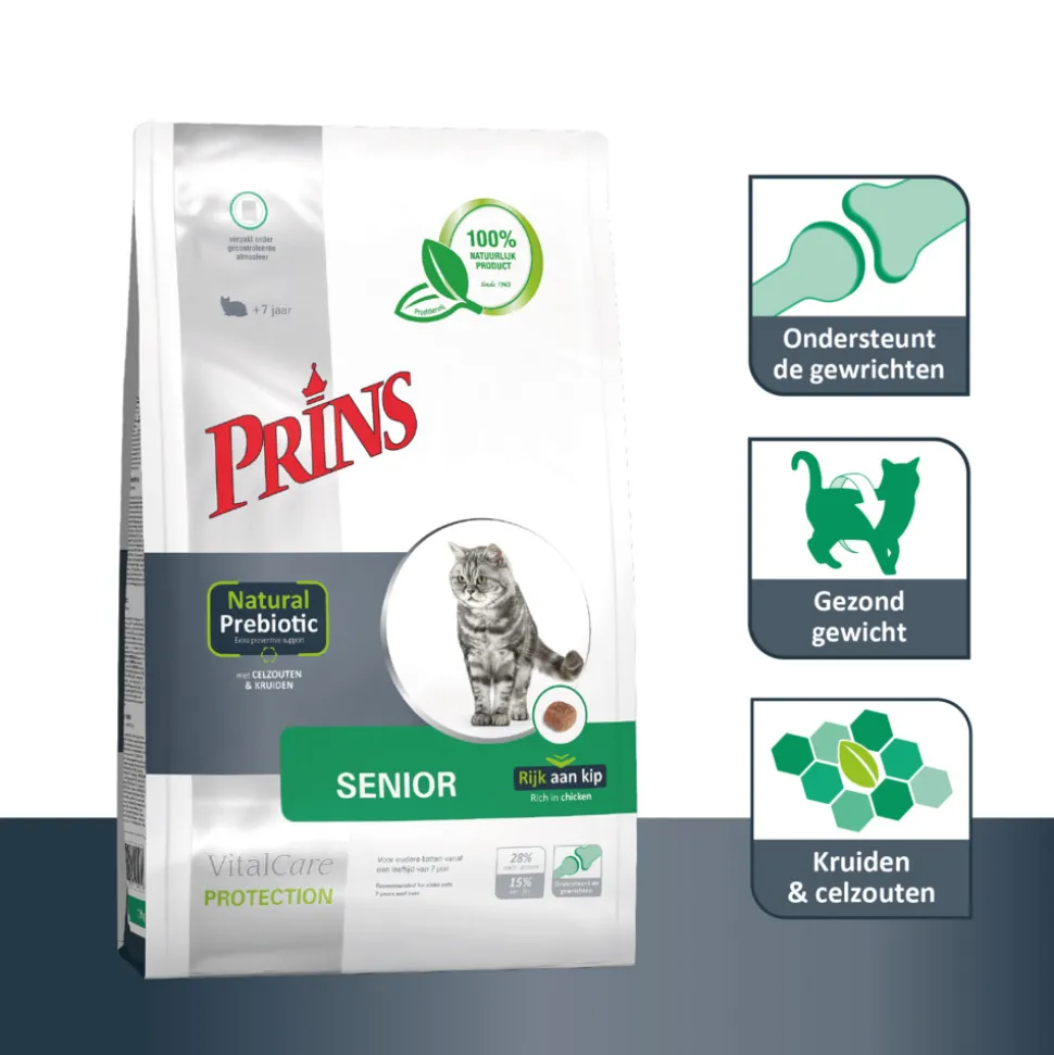 Prins VitalCare Protection Senior is een voeding speciaal voor oudere katten vanaf een leeftijd van 7 jaar. Deze voeding is verrijkt met kruidenextracten & Schüssler celzouten voor de juiste ondersteuning van jouw kat, is rijk aan kip en bevat hoogwaardige voedingsvezels die bijdragen aan een gezonde darmflora. De voeding bevat speciale mineralen (hexametafosfaat) die de vorming van tandplaque helpen te verminderen.