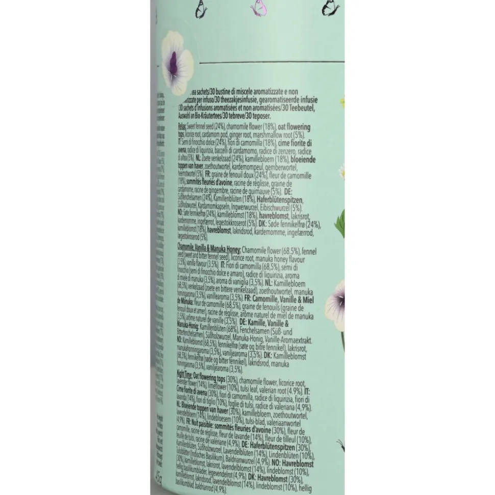 Natuurlijk cafeïnevrij en ethisch geproduceerd, biologisch Ingrediënten: Joy: Citroenmelisseblad (29%), citroengras (29%), citroenverbenablad (13%), zoethoutwortel, citroenvana tulsiblad (5%), lavendelbloem, sinaasappel aroma van etherische olie (5%), aroma van etherische olie van bergamot, rozenbloem. Night Time Berry: Rozenbottel, hibiscusbloem, kamillebloem (15%), lavendelbloem, zoethoutwortel, gemberwortel, echinaceablad en -wortel (6%), vlierbes (4%), zwarte bessenfruit (4%), valeriaanwortel, bosbessensmaak, zwarte bessensmaak. Relax: Zoet venkelzaad (24%), kamillebloem (18%), haverbloeiende toppen, zoethoutwortel, kardemompeul, gemberwortel, heemstwortel (5%). Peace: Kamillebloem, groene muntblad (36%), zoethoutwortel, lavendelbloem, ashwagandhawortel (5%), hennepzaadoliekorrels (4%). Chamomile Vanilla & Manuka Honey: Kamillebloem (68,5%), venkelzaad (zoete en bittere venkelzaad), zoethoutwortel, manukahoningaroma (3,5%), vanillearoma (3,5%).