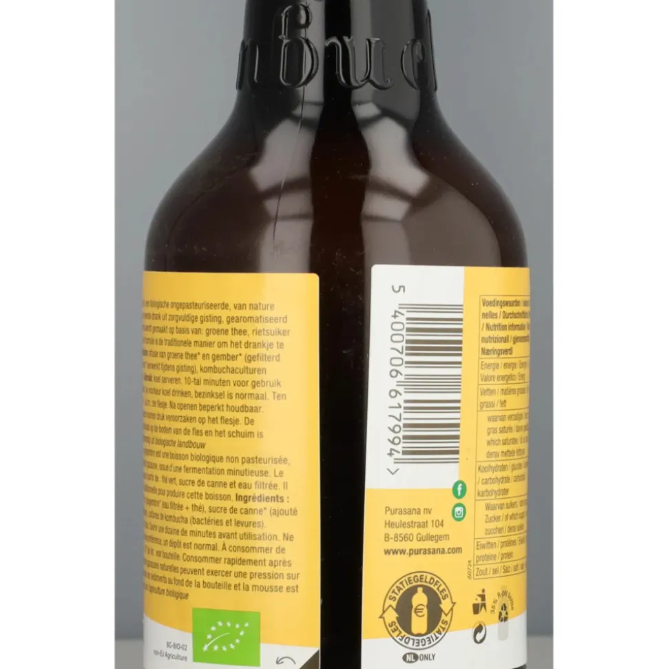 Purasana Kombucha Drank Gember is een licht koolzuurhoudende gemberthee dat ontstaan is door fermentatie. Fermentatie is een proces waarbij micro-organismen, zoals bacteriën, schimmels en gisten, worden gebruikt waarna er een probiotica- en enzymencultuur wordt gecreëerd. Kombucha is 100% biologisch, vrij van conserveringsmiddelen, vegan gecertificeerd en bevat geen toegevoegde zoetstoffen, geur-, kleur- of smaakstoffen.