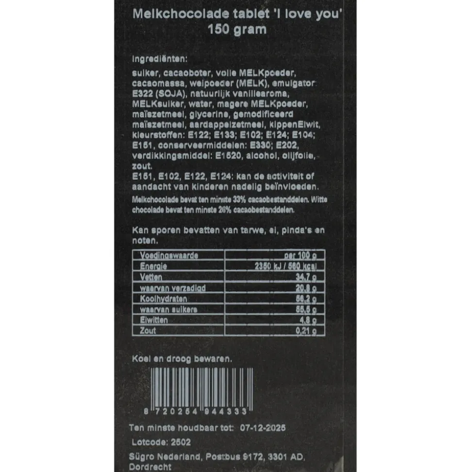 Pure Verwennerij Chocolade Tablet I Love Youis een luxe chocoladereep van 150 gram, ideaal om je genegenheid te tonen aan een speciaal persoon. Deze chocolade is vervaardigd met zorgvuldig geselecteerde ingrediënten, wat resulteert in een rijke en volle smaakbeleving. De elegante verpakking met de boodschap ‘I Love You’ maakt het een perfect cadeau voor romantische gelegenheden zoals Valentijnsdag, jubilea of gewoon om iemand te verrassen.