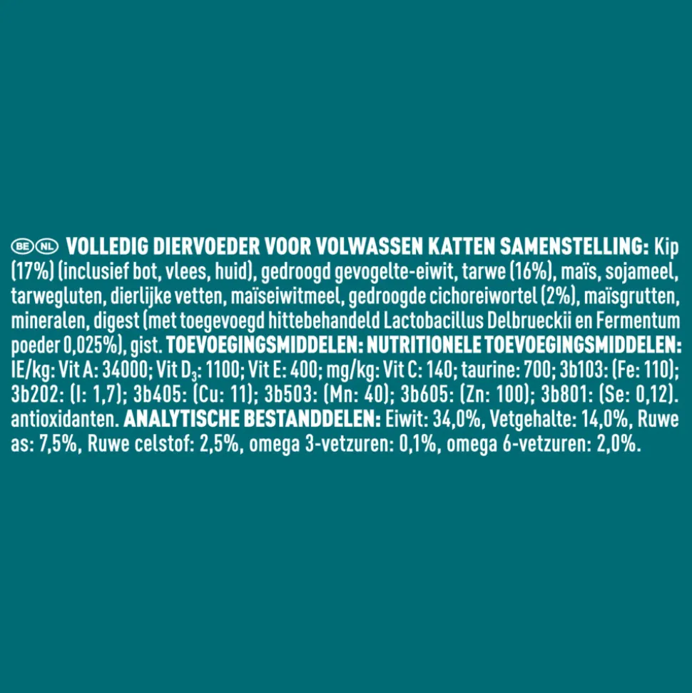 Kip (17%), gedroogde gevogelte-eiwitten, volkoren tarwe (17%), maïs, sojameel, tarweglutenmeel, dierlijk vet, maïsglutenmeel, gedroogde cichoreiwortel, maïsgries, mineralen, digest (met toegevoegd hittebehandeld Lactobacillus Delbrueckii en Fermentum poeder (0,025%)), gist.” “Analytische bestanddelen: Eiwit: 34,0%; Vetgehalte: 14,0%; Ruwe as: 7,5%; Ruwe celstof: 2,5%; Omega 6 vetzuren: 2,0%. Toevoegingsmiddelen: Nutritionele toevoegingsmiddelen: IE/kg: Vit. A: 33 000; Vit. D3: 1 000; Vit. E: 460; mg/kg: Vit. C: 140; Taurine: 700; IJzer(II)sulfaat-monohydraat: 204; Calciumjodaat, watervrij: 2,6; Koper(II)sulfaat-pentahydraat: 41; Mangaan(II)sulfaat-monohydraat: 97; Zinksulfaat-monohydraat: 340; Natriumseleniet: 0,24; Met antioxidanten.