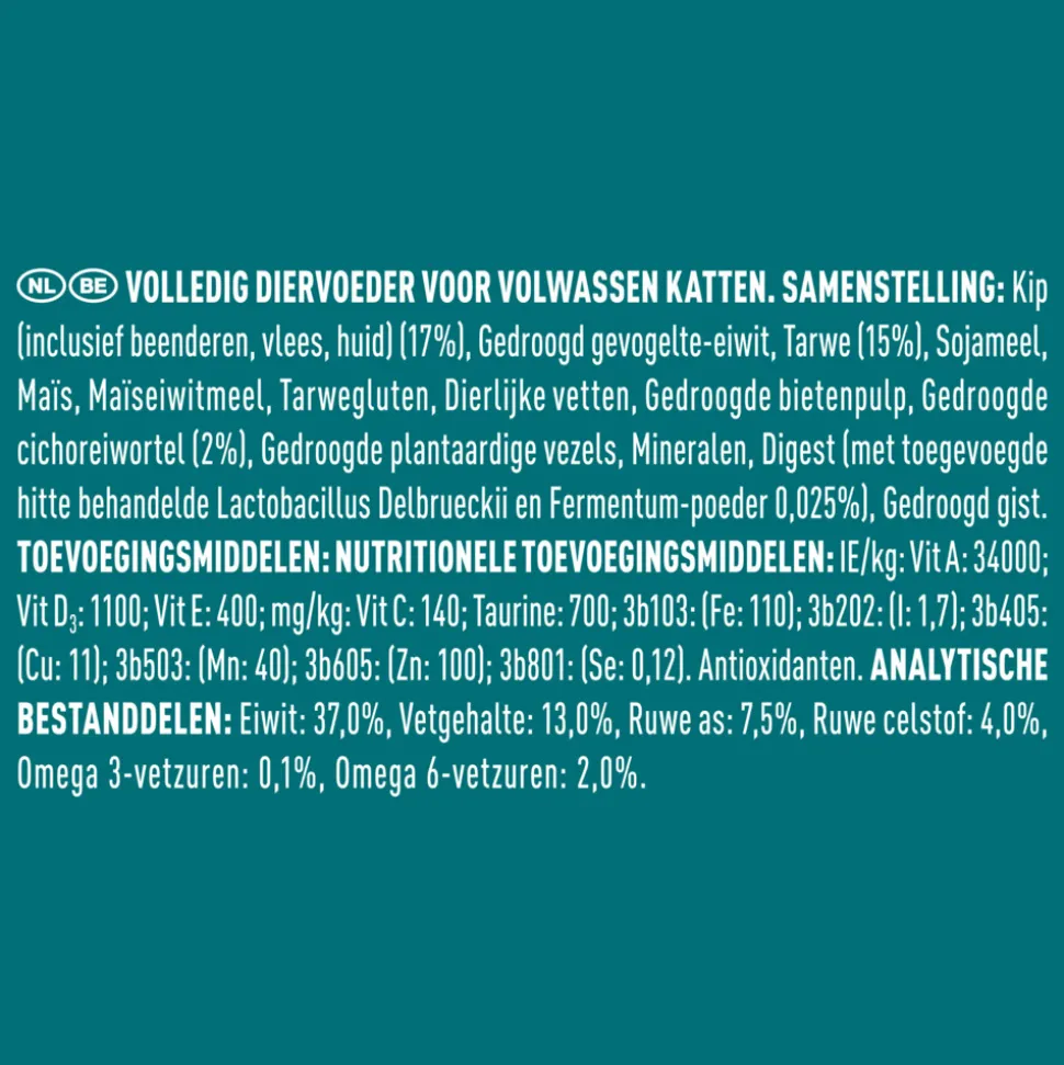 Kip(16%), gedroogde gevogelte-eiwitten, tarwe (14%), sojameel, maïs, maïsglutenmeel, dierlijk vet, tarweglutenmeel, gedroogde bietenpulp, gedroogde cichoreiwortel, mineralen, digest (met toegevoegd hittebehandeld Lactobacillus Delbrueckii en Fermentum poeder (0,025%)), gist