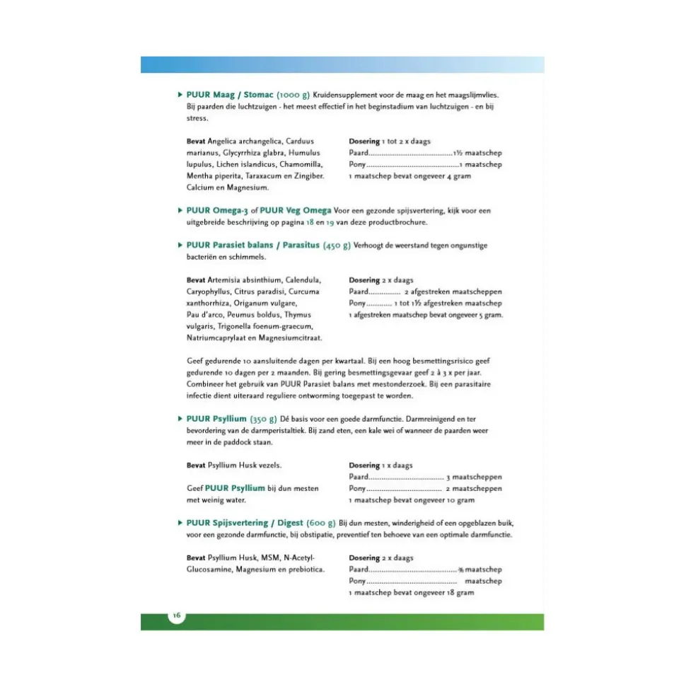 PUUR Stomac Paard – Pony ondersteunt een gezonde maag en helpt bij het verminderen van maagklachten bij paarden en pony’s. De natuurlijke formule bevordert een goede spijsvertering en draagt bij aan het herstel van het maagslijmvlies. PUUR Stomac is mild en geschikt voor dagelijks gebruik. Het product bevordert het comfort en welzijn van jouw paard of pony.