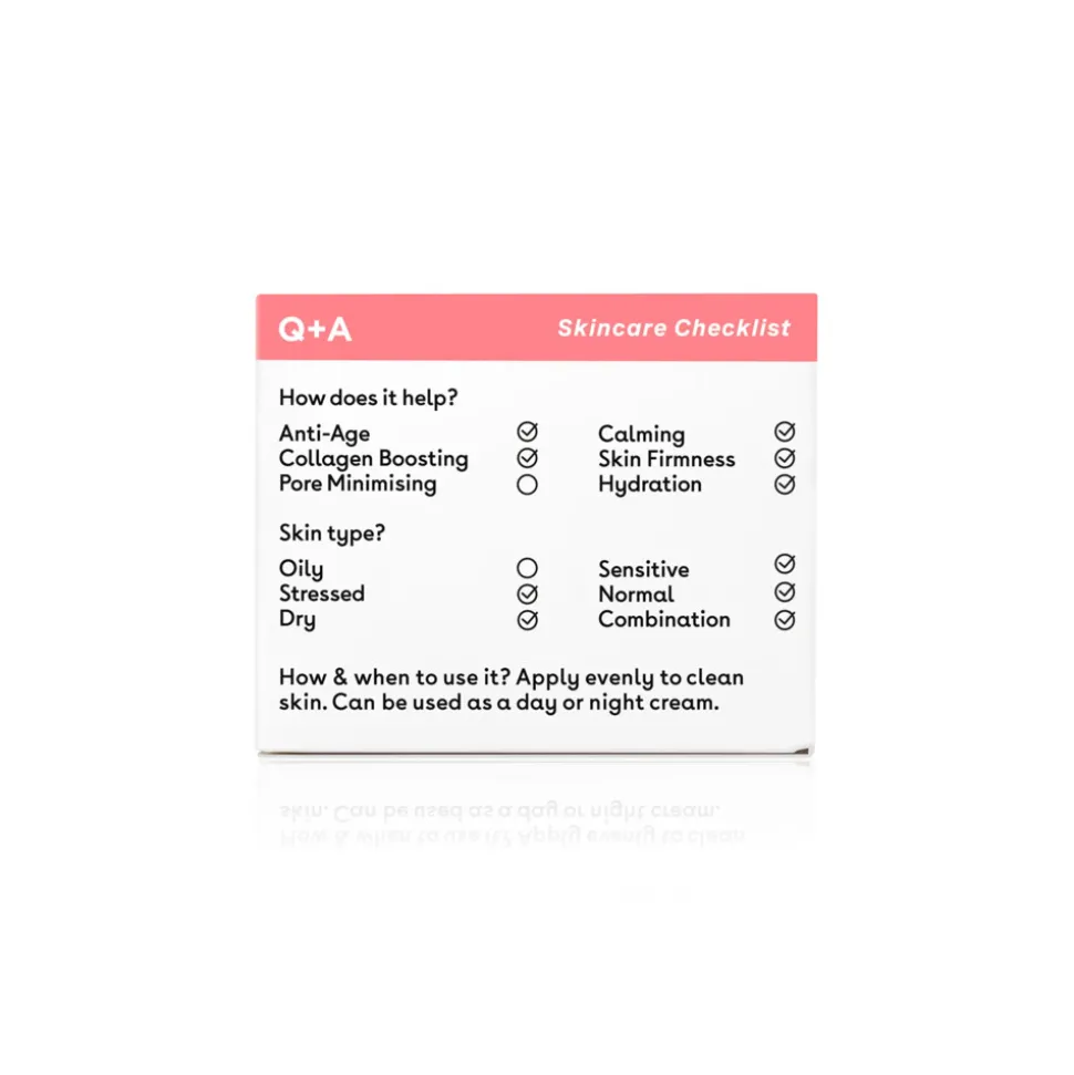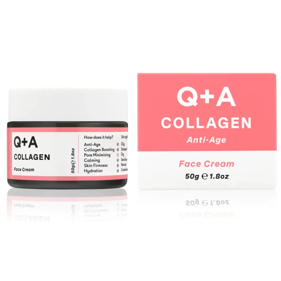 De Q+A Collagen Dagcrème is een rijke en voedende dagcrème die de huid helpt te verstevigen en te hydrateren. De crème bevat collageen, een eiwit dat van nature in de huid voorkomt en bijdraagt aan een gezonde en jeugdige uitstraling. Naast collageen bevat de crème ook hydraterende en voedende ingrediënten zoals sheaboter, avocado-olie en haverextract.