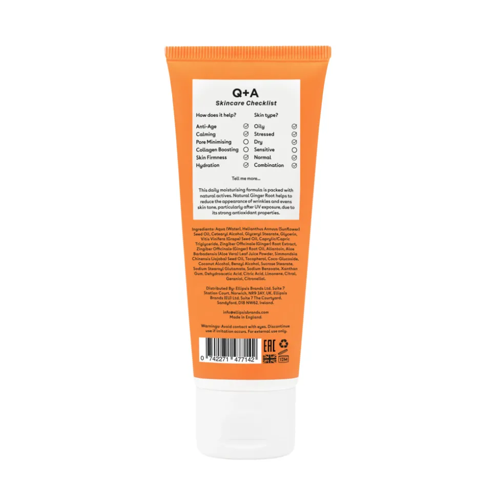 Q+A Ginger Root Daily Moisturiser is een zachte crème voor elke dag. Gemberwortel geeft je huid een gezonde glow en verzacht fijne lijntjes. De toegevoegde vitamine E voedt en beschermt de huid. Tot slot helpt ook aloë vera mee aan een zachte, gehydrateerde huid. Aloë vera zit vol hydraterende polysacchariden en creëert een beschermend laagje op je huid.