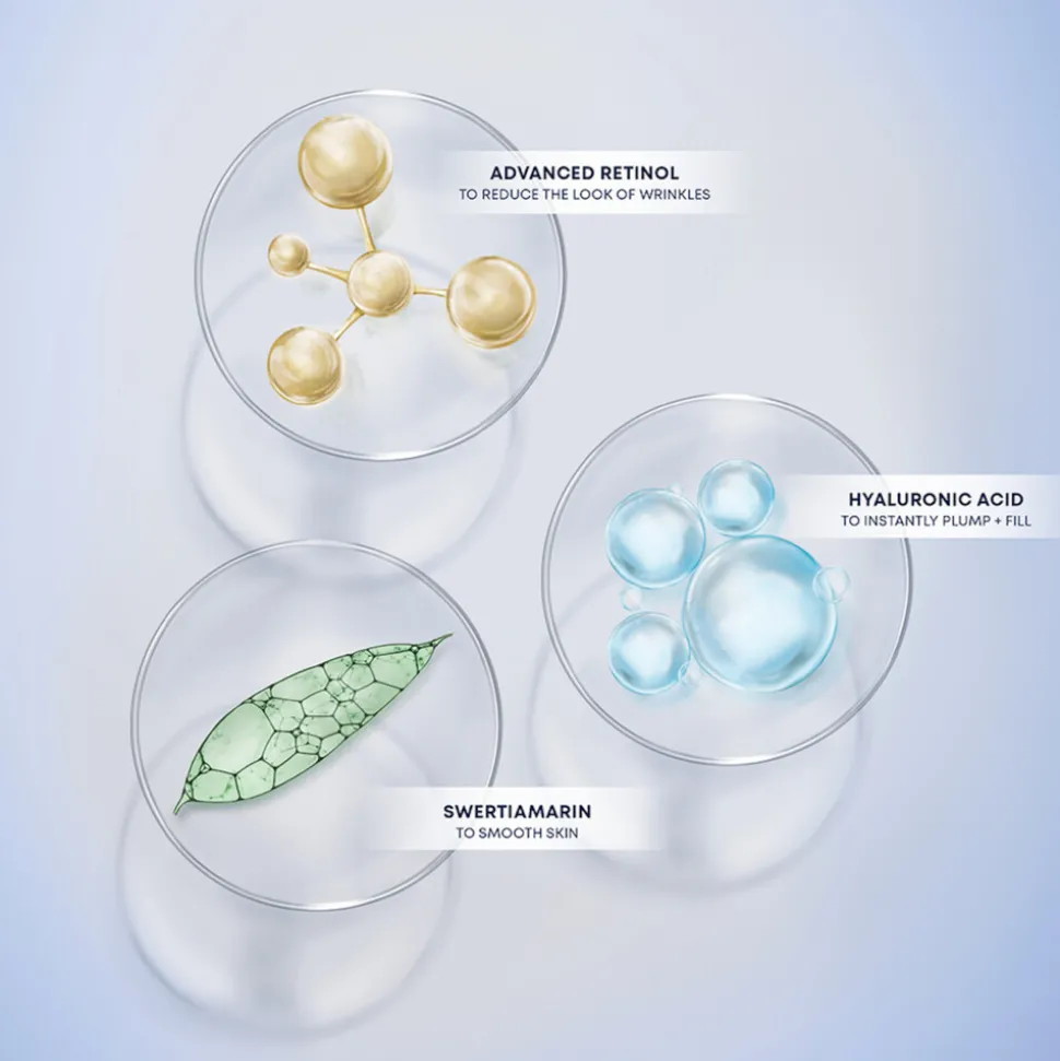 Een contourende moisturizer met Retinol die het gezicht en de hals zichtbaar verstevigt in 1 week. Ontwikkeld in samenwerking met dermatologen en plastisch chirurgen, werkt deze moisturizer in op elke laag van het huidoppervlak om gezicht, hals en kaaklijn zichtbaar te verstevigen, liften en contouren. De huid lijkt direct gehydrateerd. Na 1 week zijn horizontale lijntjes in de hals zichtbaar met 49% verminderd en heeft 97% een zichtbaar stevigere huid op gezicht en hals. Deze niet-invasieve crème bevat hyaluronzuur om de huid zichtbaar voller te maken, terwijl retinol en swertiamarin de huid zichtbaar verstevigen en herstructureren.
