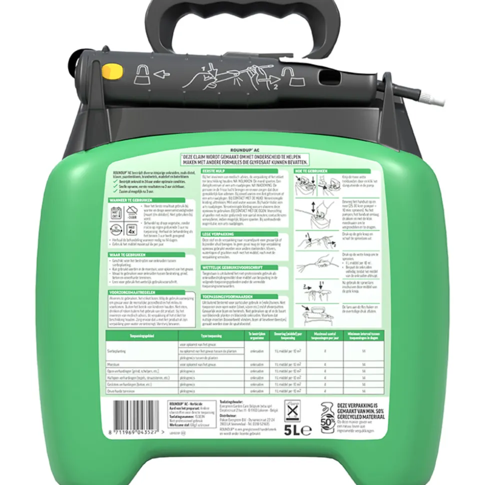 ROUNDUP® AC Totaal Onkruidvrij Onkruidspuit 5L is een snelwerkende onkruidbestrijder: actief groeiend onkruid wordt binnen een dag gedood. Het hoeft niet aangemengd te worden en is altijd juist gedoseerd. De werkzame stof in deze ROUNDUP® onkruidbestrijder is azijnzuur, dat voorkomt in de natuur en in kleine hoeveelheden ook in planten. Wanneer deze stof in geconcentreerde vorm op ongewenste planten wordt gespoten, verandert ze in een snelwerkende onkruidverdelger. De stof doodt heel snel verschillende lagen van de plantencellen, waardoor de groei stopt en de plant sterft. ROUNDUP® AC is snel inactief in de bodem waardoor zaaien en planten al mogelijk is 1 dag na toepassing. Geschikt voor het bestrijden van onkruiden tussen sierbeplanting. Kan gebruikt worden in de moestuin, voor opkomst van het gewas. Ideaal te gebruiken voor onkruiden tussen bestrating, grind, beton en onverharde terreinen.