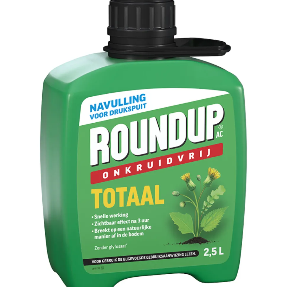 Roundup® AC Totaal Onkruidvrij Onkruiddrukspuit Navulverpakking 2,5L is een snelwerkende onkruidbestrijder: actief groeiend onkruid wordt binnen een dag gedood. Het hoeft niet aangemengd te worden en is altijd juist gedoseerd. Deze 2,5L navulverpakking is geschikt voor de Roundup® AC PUMP ‘N GO, maar is ook goed te gebruiken voor in een normale drukspuit. De werkzame stof in deze in deze Roundup® onkruidbestrijder is azijnzuur, dat voorkomt in de natuur en in kleine hoeveelheden ook in planten. Wanneer deze stof in geconcentreerde vorm op ongewenste planten wordt gespoten, verandert ze in een snelwerkende onkruidverdelger. De stof doodt heel snel verschillende lagen van de plantencellen, waardoor de groei stopt en de plant sterft. Roundup® AC is snel inactief in de bodem waardoor zaaien en planten al mogelijk is 1 dag na toepassing. Geschikt voor het bestrijden van onkruiden tussen sierbeplanting. Kan gebruikt worden in de moestuin, voor opkomst van het gewas. Ideaal te gebruiken voor onkruiden tussen bestrating, grind, beton en onverharde terreinen.
