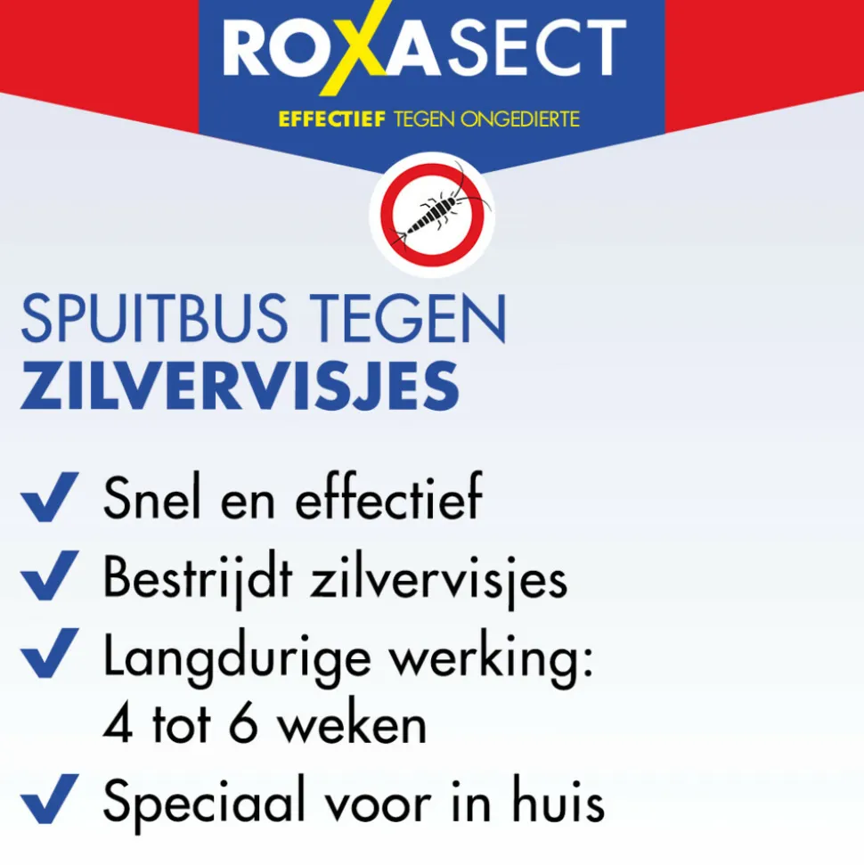 Roxasect Zilvervisjes Spray bestrijdt zilvervisjes, papiervisjes en ovenvisjes effectief en langdurig. De werkzame stoffen verstoren de overdracht van de impuls in de zenuw van het zilvervisje, waardoor het zilvervisje doodgaat.