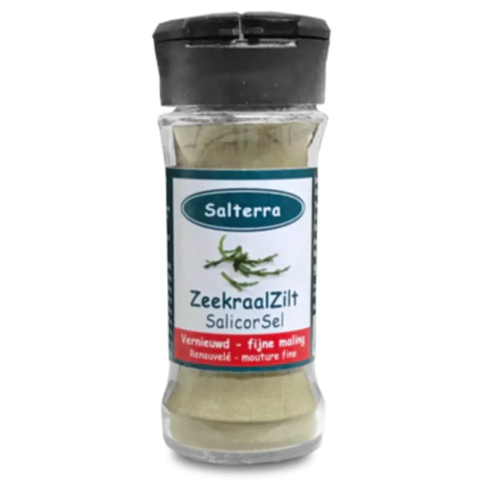 Salterra Zeekraalzilt Fijn is 100% gedroogde zeekraal, vol zilte mineralen uit zee en kwelder. Dit is een kruidige, vezelrijke vervanger van zout en het heeft een handige doseerdop. Zeekraal is een bron van tal van andere mineralen zoals ijzer, koper, mangaan, eiwit en voedingsvezel. Ondanks de zoute smaak bevat zeekraalzilt een laag natrium gehalte. 100% natuurlijk, zonder kunstmatige toevoegingen en geteeld op puur oceaanwater in Baja California Mexico.
