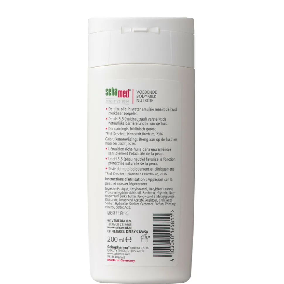 Sebamed Bodymilk is speciaal afgestemd op de behoeften van de droge huid. De rijke olie-in-water-emulsie bevat een vochtinbrengend complex bestaande uit glycerine, jojoba-olie en sheabutter dat beschermt tegen uitdroging, waardoor de huid beter in staat is vocht vast te houden. D-panthenol vermindert tevens irritatie en versterkt de vochtregulatie. Bij regelmatig gebruik houdt de huid 26% meer vocht vast dan wanneer er geen huidverzorgingsproduct wordt gebruikt.