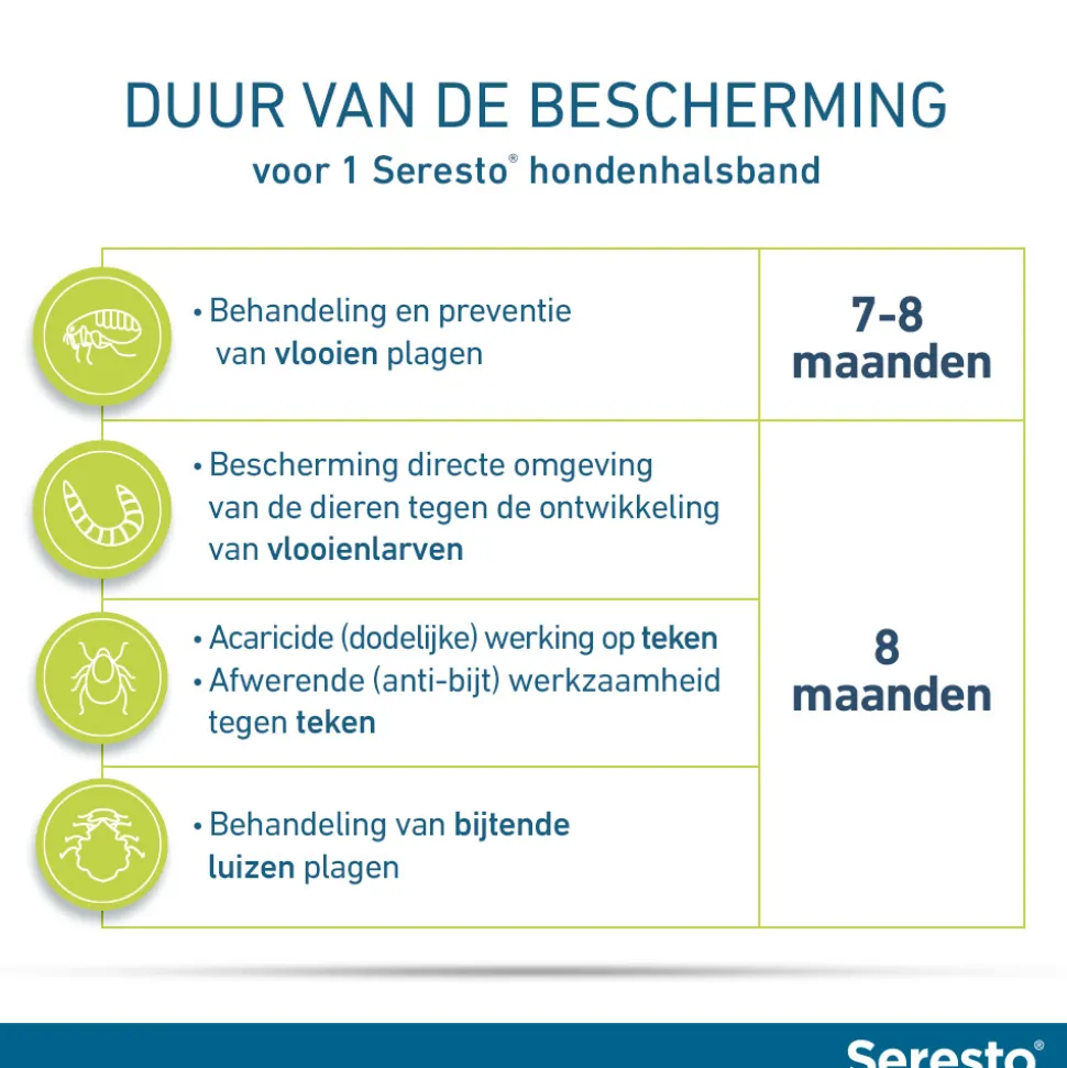 Let op! Seresto® mag niet gebruikt worden bij: – Pups die jonger zijn dan 7 weken – Kittens die jonger zijn dan 10 weken – Dieren die overgevoelig zijn voor de werkzame bestanddelen of één van de hulpstoffen.
