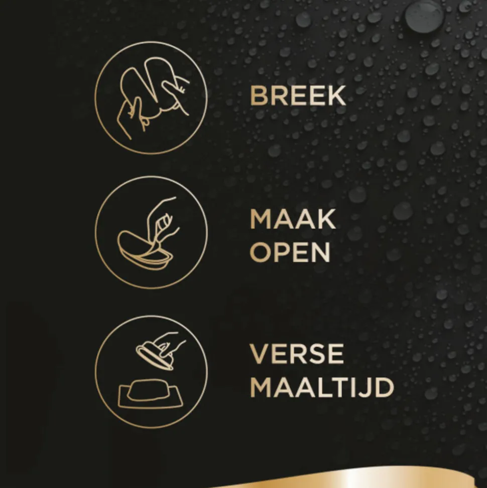 Breek, open, verse maaltijd. Een portie van 37.5 g bevat 36 kcal. Verminder droog diervoeder met circa 10 g per elke gevoerde portie van 37.5 g. Vanaf 12 maanden kan je overgaan op voeding voor volwassen katten. Zorg dat er altijd vers drinkwater beschikbaar is. Op kamertemperatuur opdienen.