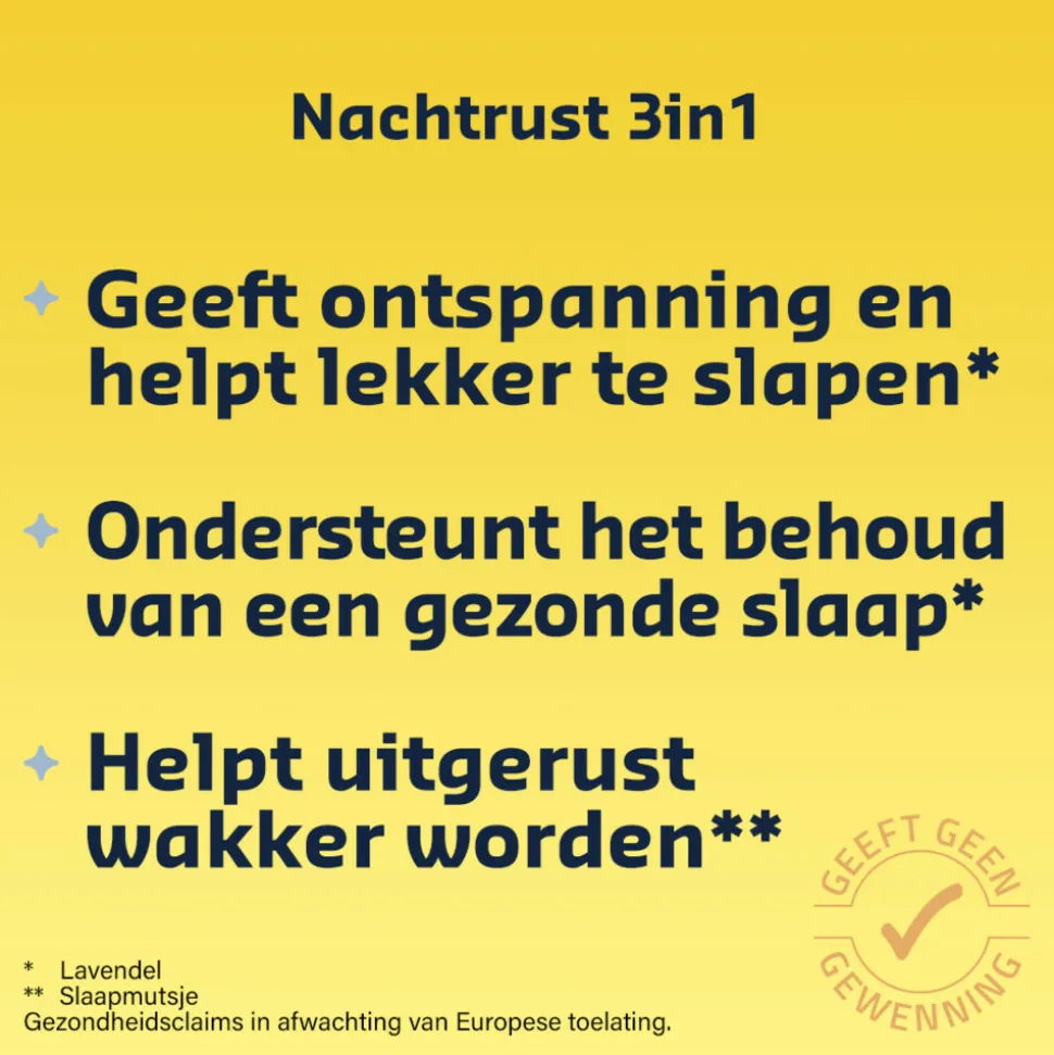 Shiepz Nachtrust 3in1 is een slaapformule die op 3 manieren de slaap ondersteunt. Geeft ontspanning in de avond* dankzij lavendelolie, het ondersteunt het behoud van een gezonde slaap dankzij slaapmutsje en alles bij elkaar helpt het je uitgerust wakker worden* dankzij slaapmutsje.