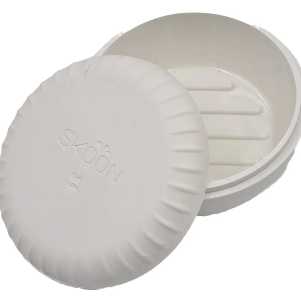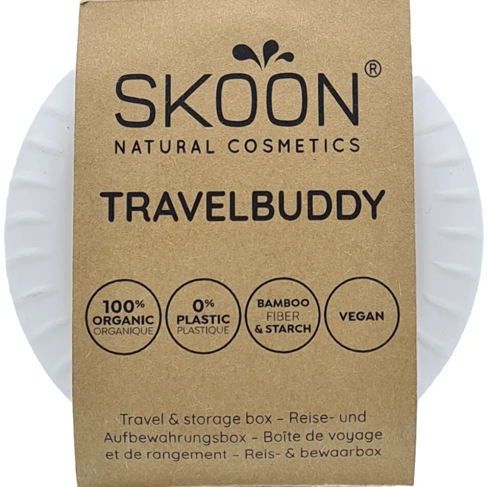 Voor het bewaren en meenemen in je toilettas van een SKOON bar, gemaakt van bamboe vezels en zetmeel. De travelbuddy is 100% plastic vrij en volledig biologisch afbreekbaar, dat is dan weer heel fijn voor onze planeet.