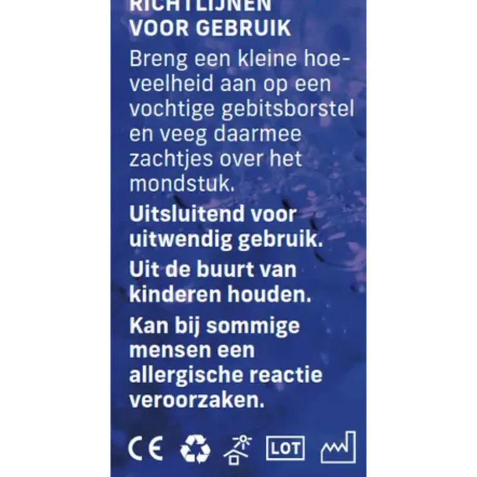 Breng een kleine hoeveelheid aan op een vochtige gebitsborstel en veeg daarmee zachtjes over het mondstuk. Uitsluitend voor uitwendig gebruik.