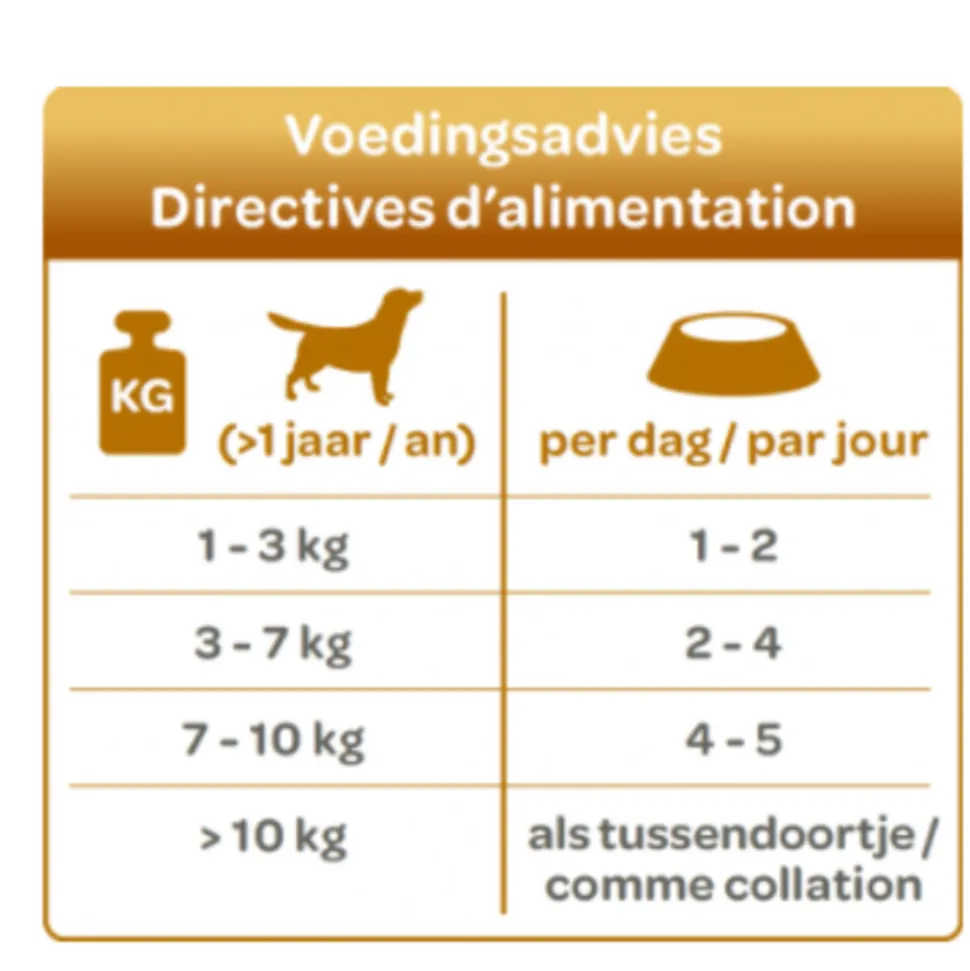 *Het advies in de voedingstabel is een richtlijn. Andere factoren zoals leeftijd, ras en activiteit spelen ook een rol bij de dagelijkse voedingsbehoefte van je hond.