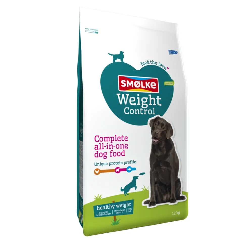 Smølke Weight Control is een eerlijk product gemaakt met natuurlijke ingrediënten. De toevoeging van natuurlijke vezels stimuleert een verzadigd gevoel. Smølke Weight Control bevat 20% minder vet dan de reguliere Smølke hondenbrokken voor volwassen honden en L-carnitine ondersteunt de vetstofwisseling. Door Smølke te voeren weet je zeker dat je jouw hond alles geeft wat hij nodig heeft. Zo kun jij je focussen op leuke dingen doen samen met je hond!