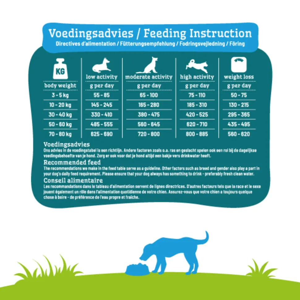 Kippenmeel (18%), mais, gerst, sorghum, cellulose (5%), verse kip (4%), lamsmeel (4%), rijst, bietenpulp, kippenvet (gestabiliseerd met natuurlijke tocoferolen), gehydroliseerd eiwit, MSC-gecertificeerde vismeel (2%)*, biergist, MSC-gecertificeerde visolie (0,8%)*, cichorei (0,7%), vitamine en mineralen mix (bevat natriumhexametafosfaat 0,1%). *Uit een MSC gecertificeerde duurzame visserij. www.msc.org/nl
