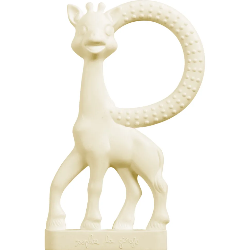 Mooie cadeauset met Sophie de giraf en een vanille bijtring. 100% natuurlijk speelgoed voor de hippe baby! Gemaakt van natuurlijke rubber en verf en daarom van nature Phthalates, BPA en PVC vrij! Het eerste babyspeeltje waarmee uw baby al zijn zintuigen ontwikkelt! Kijken: dankzij de donkere vlekjes en contrasten op het gehele lichaam, trekt het baby’s aandacht en wordt zo gemakkelijk een herkenbaar en geruststellend voorwerp voor uw baby. Luisteren: dankzij het grappige piepje wordt baby’s gehoor gestimuleerd en maakt hij kennis met oorzaak-gevolg. Proeven: het is soepel en heeft vele onderdelen waar baby aan kan sabbelen en op kan bijten (oortjes, hoorntjes, pootjes) en dus ideaal voor baby’s tandvlees wanneer de tandjes doorkomen. Het bestaat voor 100% uit natuurlijke rubber en verf en is daarom volledig veilig voor baby. Voelen: het is licht van gewicht en perfect geschikt voor baby’s kleine handjes en door de lange poten en hals kan baby hem gemakkelijk vastpakken. De huid is zo zacht als die van mamma en stelt baby gerust en wekt emotionele reacties bij hem op die hem gerust zullen stellen… Ruiken: het bijzondere geurtje van natuurlijk rubber afkomstig van de Hévéa geeft het werkelijk iets aparts waardoor baby hem gemakkelijk herkent tussen al zijn speeltjes. Afmeting: 17cm hoog.