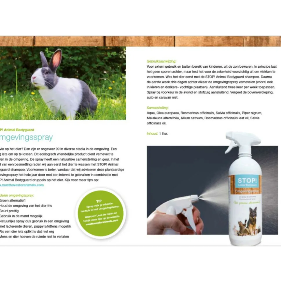 Hét groene alternatief! Dit ecologische vriendelijke product vernevel je in de omgeving. Deze spray heeft een natuurlijke samenstelling die een fysieke barrière vormt voor vlooien in de omgeving. Je kunt de plantaardige omgevingsspray het hele jaar door met interval gebruiken in combinatie met STOP! Animal Bodyguard druppels.
