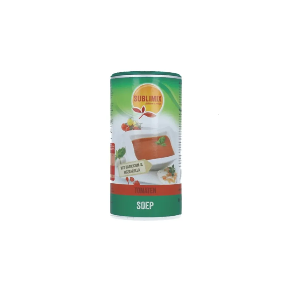 Sublimix Glutenvrij Italiaanse Tomatensoep is een hartig en mager tussendoortje. Doe een eetlepel Sublimix Tomatensoeppoeder in een mok, giet hier kokend water op, een minuutje roeren en je hebt een lekker tomatensoepje.