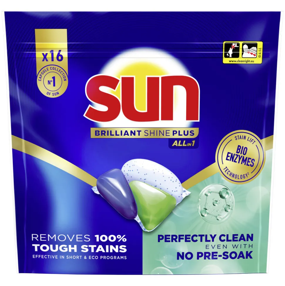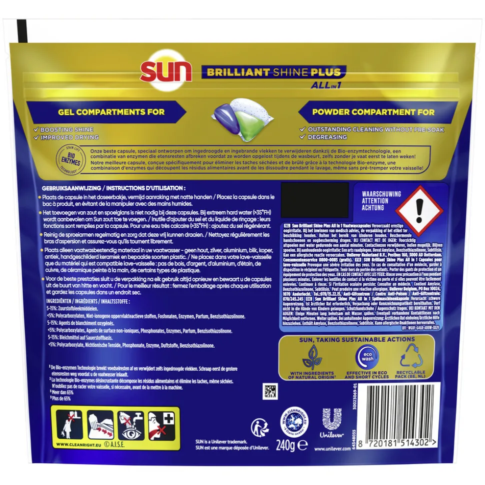 - Sun Brilliant Shine Plus All-in 1 Vaatwascapsules met bio-enzymen