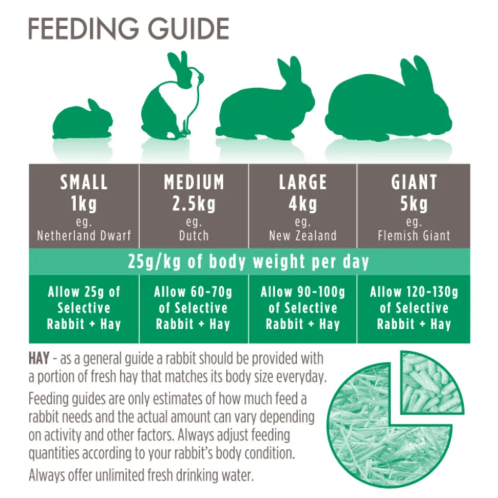 Een gemiddeld volwassen konijn (2,5 kg) heeft 60-70 g/dag Selective House Rabbit nodig. Het dier moet altijd verse groenten, hooi van goede kwaliteit en schoon drinkwater hebben. Koel en droog bewaren.