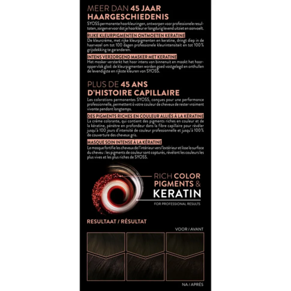 SYOSS permanente haarkleuringen, ontworpen voor professionele resultaten, zorgen ervoor dat je haarkleur er langdurig levend uitziet en aanvoelt. De kleurcrème, met rijke kleurpigmenten en keratine, dringt diep in de haarvezel om tot 100 dagen professionele kleurintensiteit en tot 100 % grijsdekking te garanderen. Het intens verzorgend masker met keratine versterkt het haar intens van binnenuit en maakt het haaroppervlak glad: de kleurpigmenten worden goed vastgelegd en onthullen de levendigste en rijkste kleuren van SYOSS.