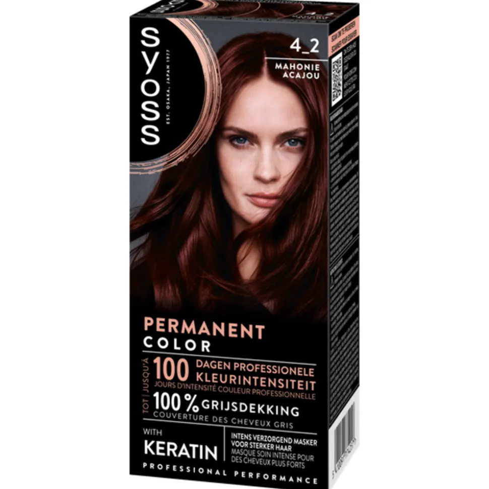 SYOSS permanente haarkleuringen, ontworpen voor professionele resultaten, zorgen ervoor dat je haarkleur er langdurig levend uitziet en aanvoelt. De kleurcrème, met rijke kleurpigmenten en keratine, dringt diep in de haarvezel om tot 100 dagen professionele kleurintensiteit en tot 100 % grijsdekking te garanderen. Het intens verzorgend masker met keratine versterkt het haar intens van binnenuit en maakt het haaroppervlak glad: de kleurpigmenten worden goed vastgelegd en onthullen de levendigste en rijkste kleuren van SYOSS.