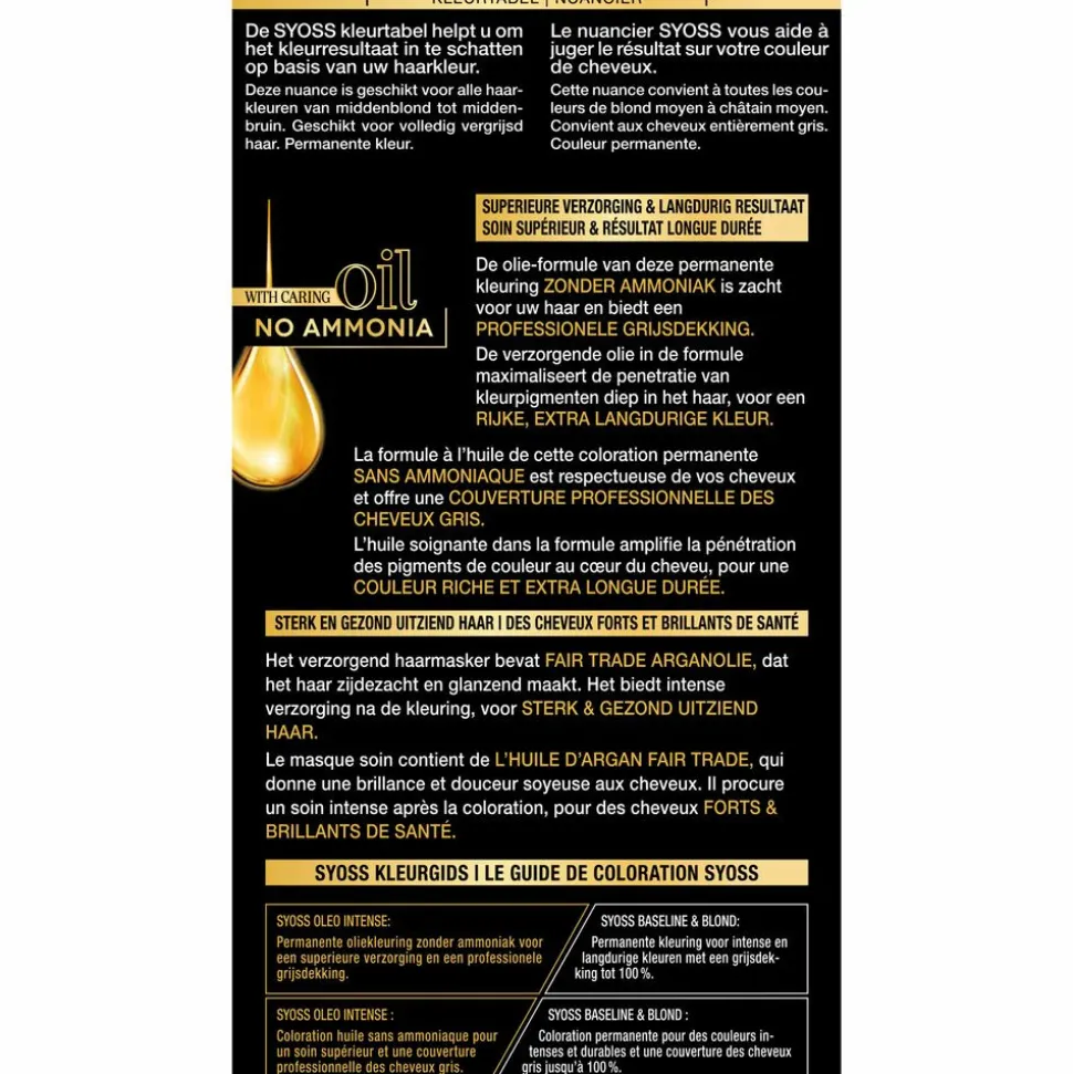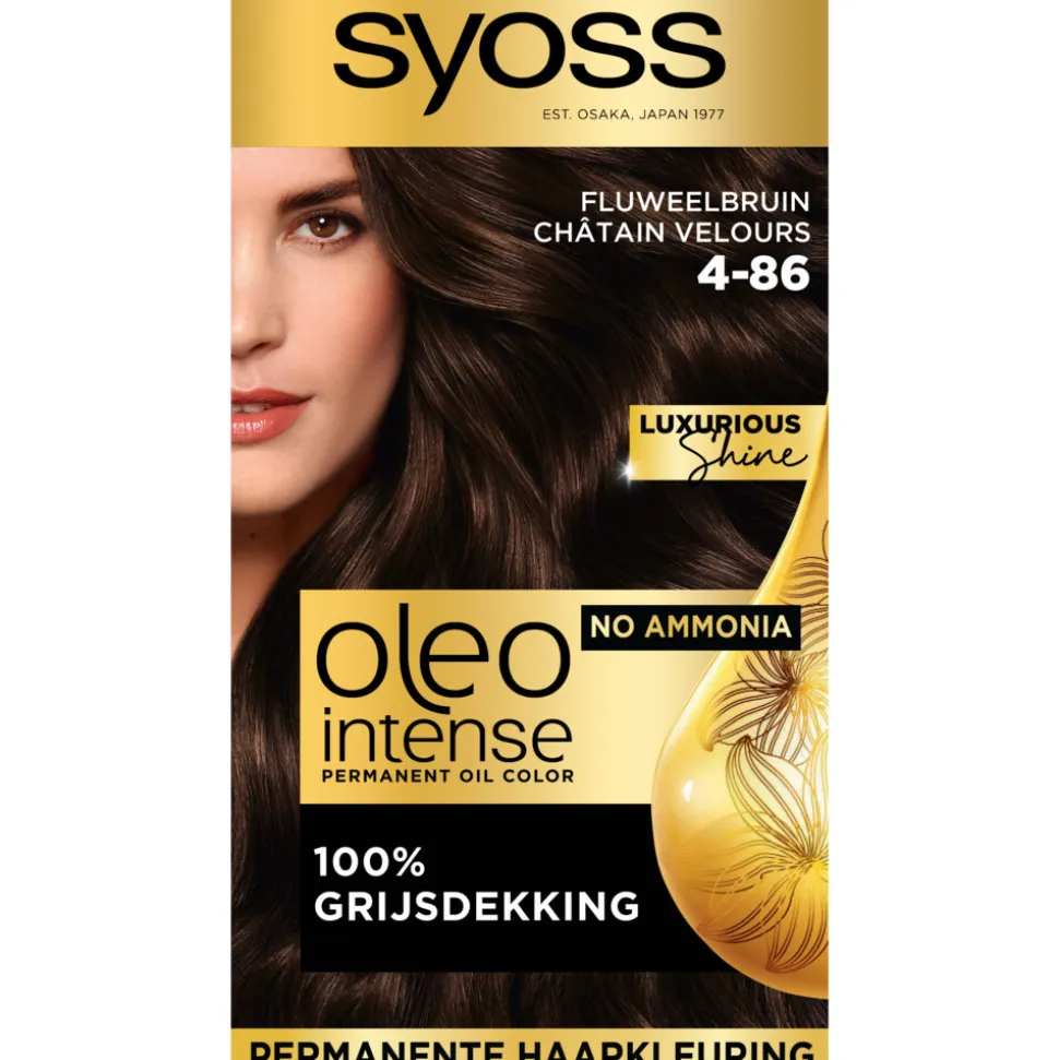 Ontdek Syoss Oleo Intense, een permanente haarkleuring met olie-formule en zonder ammoniak. Voor een superieure verzorging en een langdurig kleurresultaat met professionele grijsdekking.
