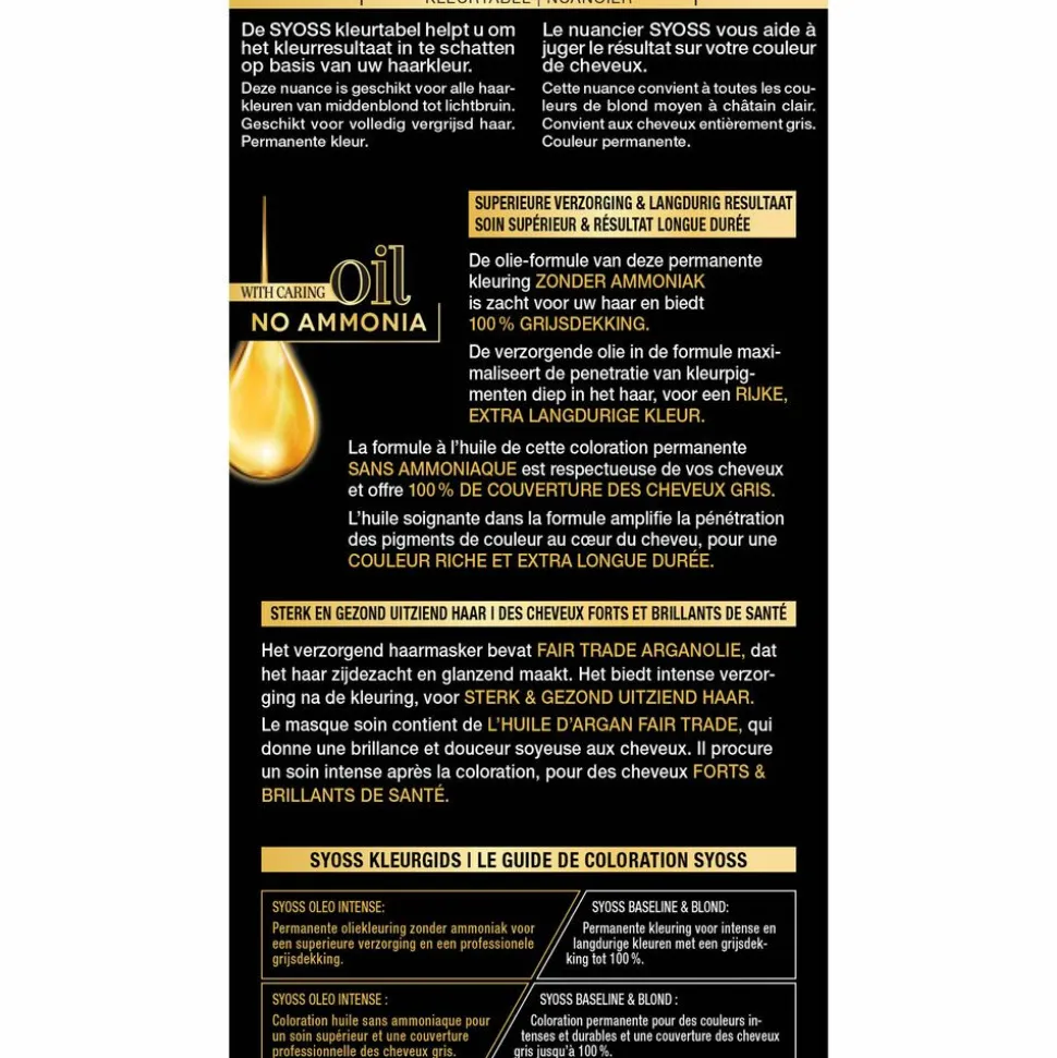 Ontdek Syoss Oleo Intense, een permanente haarkleuring met olie-formule en zonder ammoniak. Voor een superieure verzorging en een langdurig kleurresultaat met 100% grijsdekking.