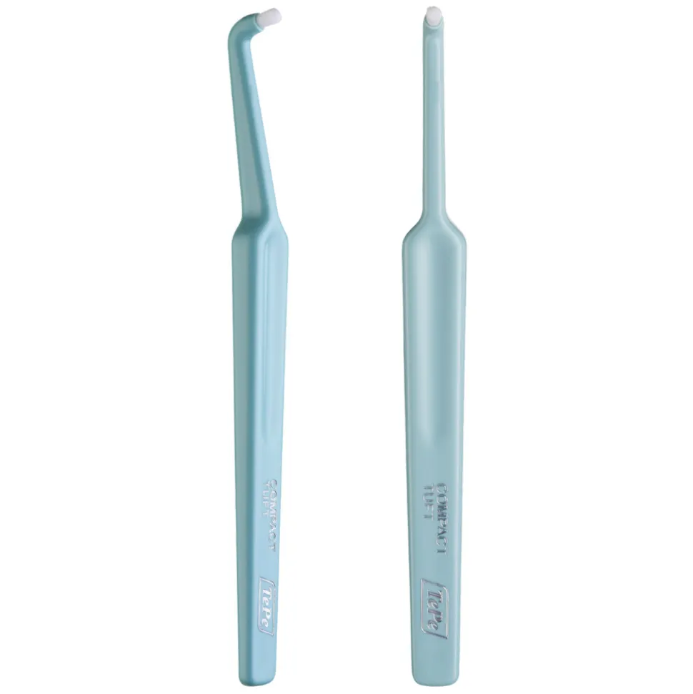 De TePe Compact Tuft is een speciale tandenborstel met een kleine, gebogen borstelkop met een stompe, afgeronde tuft. De stabiele handgreep en de dichte, stevige borstelharen maken deze tandenborstel ideaal voor het nauwkeurig reinigen van moeilijk bereikbare plaatsen. Deze borstel is geschikt voor het reinigen van staven, implantaat-ondersteunde constructies, opzetstukken voor overkappingsprothesen, vaste beugels, langs de tandvleesrand, overvolle tanden, opkomende tanden en verstandskiezen.