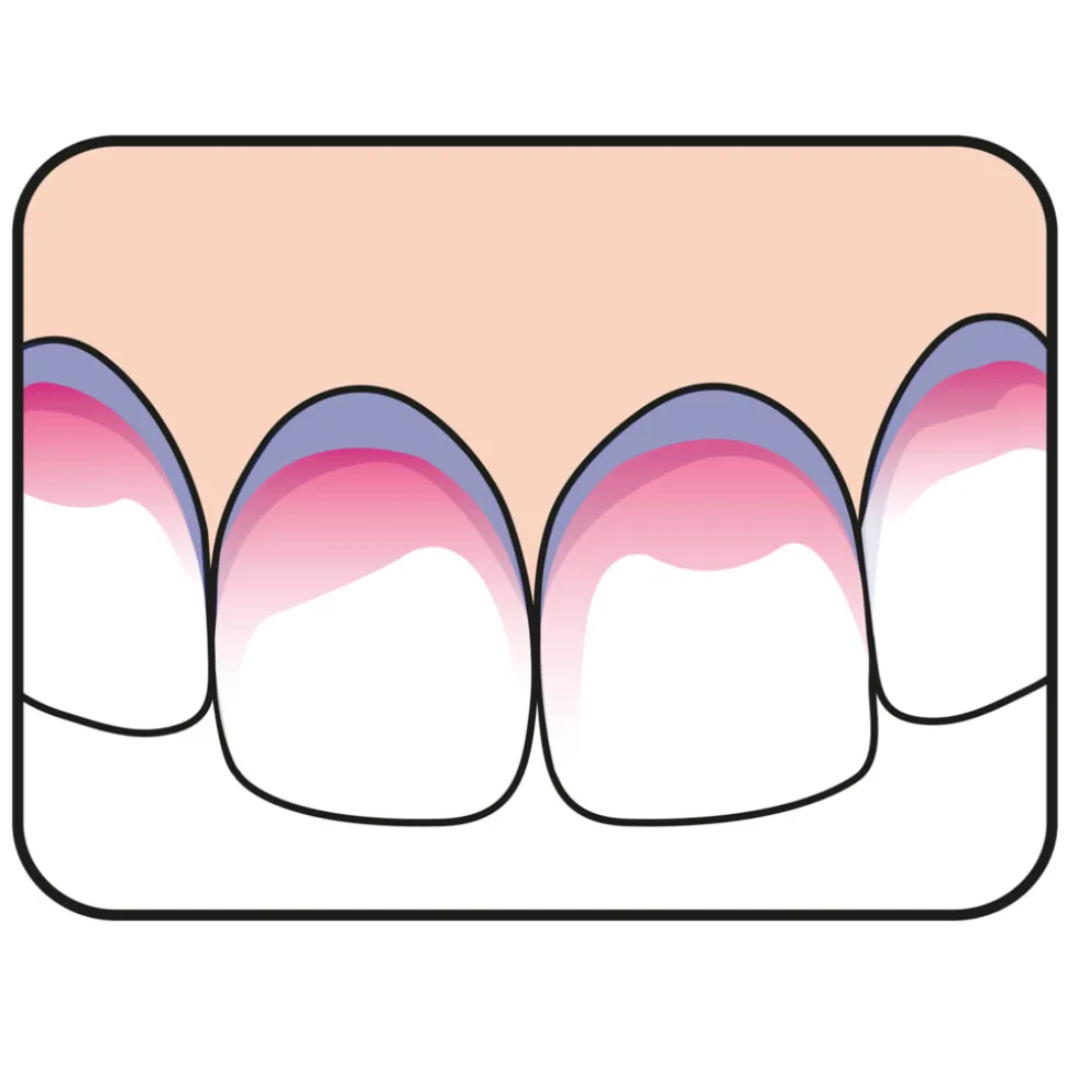 Kauw op een PlaqSearch tablet na het tandenpoetsen en interdentaal reinigen. Spoel je mond. Nu kan je duidelijk zien waar er niet goed is gepoetst en waar de tandplak dus is achtergebleven. Nieuwe tandplak kleurt rood, terwijl tandplak ouder dan 12 uur blauw kleurt. Hierdoor is duidelijk te zien waar er beter gepoetst moet worden.