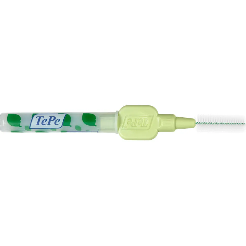 De lichtgroene rager van 0,8 mm is geschikt voor een gebit met grote openingen tussen de tanden.