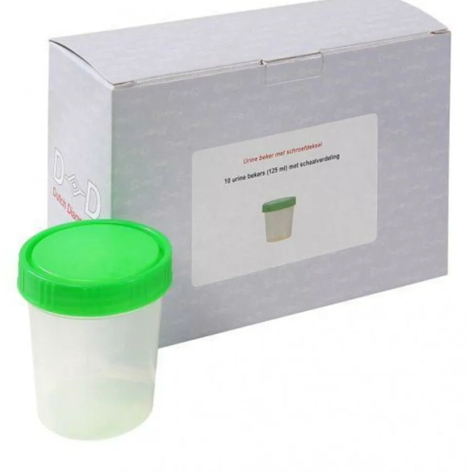 Testjezelf Urinebeker + Deksel is lekvrij af te sluiten door de handige deksel. Deze afsluitbare urinebeker met schroefdeksel is verpakt per 10 bekers. Iedere urine beker is voorzien van een schaalverdeling, maximale inhoud 125 ml. Handig in het gebruik bij onder andere de volgende testen: Zwangerschapstesten, Ovulatietesten, Urine drugstesten, Urinetesten als Totaal-Check en Blaas-Check.