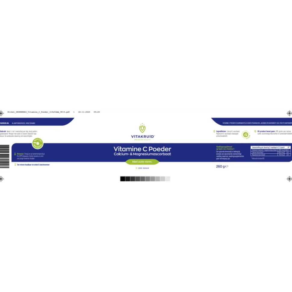 Vitakruid Vitamine C Poeder Calcium- & Magnesiumascorbaat bevat 2067 mg vitamine C. Vitakruid Vitamine C Calcium- & Magnesiumascorbaat poeder is een ascorbaat gebonden aan calcium en magnesium. Deze vorm draagt het label ontzuurt en is dus uiterst vriendelijk voor maag en darmen. Vitakruid Vitamine C Calcium- & Magnesiumascorbaat is goed mengen en te doseren door het bijgeleverde maatschepje.
