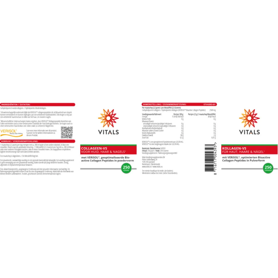 Collageen-VS van Vitals bevat een zuivere vorm van bioactieve collageenpeptiden met de merknaam VERISOL®, die een positieve invloed hebben op huid, haren en nagels. Collageen-VS is al werkzaam vanaf 2,5 gram per dag, is makkelijk te doseerbaar met een maatschep en heeft een neutrale smaak.